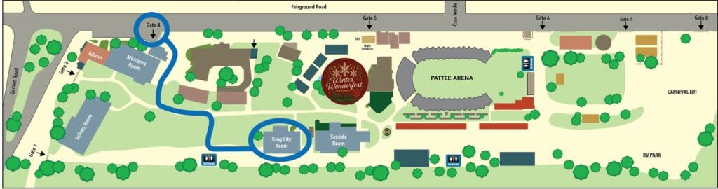 On the day of the event, street parking is available on Fairground Road. For this weekend only, enter the Fairgrounds using Gate 4 (not Gate 5, the regular gate we use) and you’ll be directed to the King City building. Doors open 10 minutes before a session. Here’s a map for how to enter the Fairgrounds and get to the King City building (note, we’ll be using the back door):